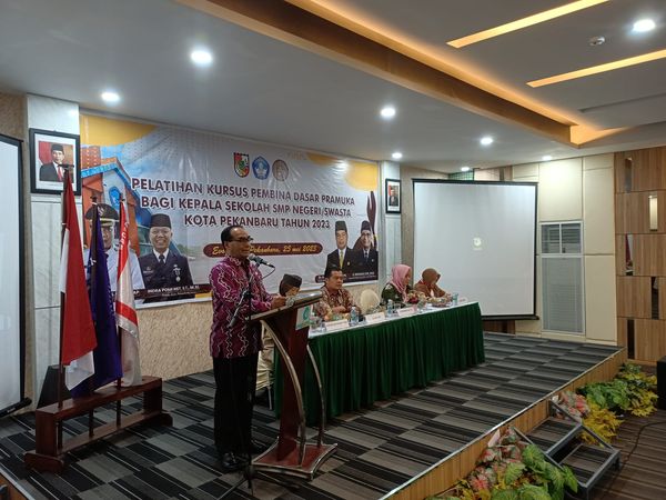 PEKANBARU - Dinas Pendidikan (Disdik) Kota Pekanbaru, menggelar Pelatihan Kursus Pembina Dasar Pramuka Bagi Kepala SMP se-Kota Pekanbaru Tahun 2023, Kamis (25/5/2023). Kegiatan dilakukan guna meningkatkan keterampilan dan pengetahuan mengenai dasar-dasar kepramukaan.