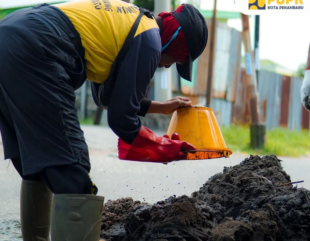 PEKANBARU - Dinas Pekerjaan Umum dan Penataan Ruang (PUPR) Kota Pekanbaru melakukan pembersihan saluran drainase di Jalan Merak dan di Jalan Soebrantas, Jumat, (31/5/2024).
